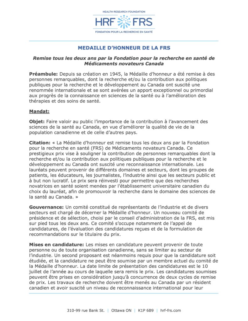 Formulaire de candidature pour la Médaille d’honneur de la FRS